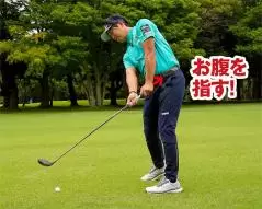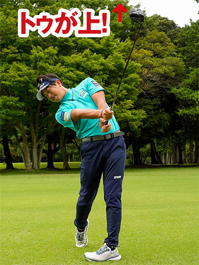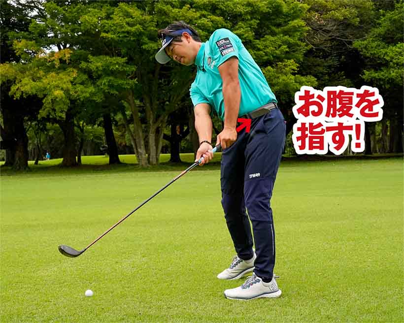 ただし条件としてフォロースルーではグリップエンドがお腹のほうを指し、クラブヘッドのトゥが上を向くようにしましょう。グリップエンドの向きがカラダから外れたり、フェースが地面を指すほど両手を返しすぎたりしてはいけません。
