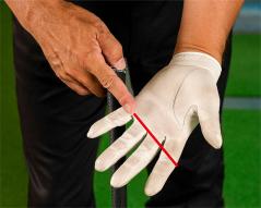 左手をしっかり握るコツとしては、左手のヒラを広げて左手の人さし指の第二関節と小指のツケ根を結ぶラインにグリップをあてがい、小指側からグリップに絡めるように握ります。小指側の3本をグリップにしっかり巻きつける感じで握ればフィット感が生まれて、力を入れなくてもしっかりと握れます。