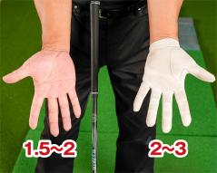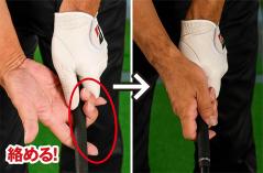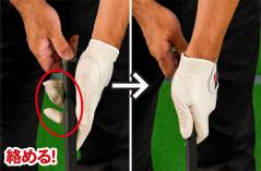 右手のほうも指をグリップに絡める感じで握りましょう。手のヒラでワシづかみすると構えた時から右手に余分な力が入りやすいので、ソフトに握って右手にもフィット感を出しましょう。両手の握りの強さの比較としては、全力を10とすれば左手は2から3くらい、右手は1・5から2くらいというイメージ。感覚なので表現が難しいところですが、そのくらいを目安にしていいと思います。