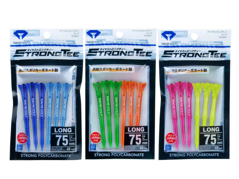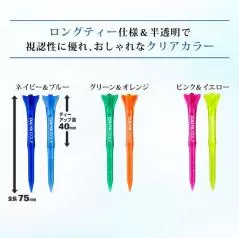 全長75mm、ティーアップ高40mmのロングタイプで、打ち出し角の調整もしやすく、ドライバーショットを安定させやすい設計。さらに視認性に優れた2色3セット(ネイビー&ブルー、グリーン&オレンジ、ピンク&イエロー)のバリエーションで、見た目でも選ぶ楽しさを提案。