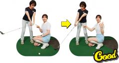 (写真左)ペットボトルを押さず手先でクラブを上げた際のダウンスイングが……(写真右)大きなアークを保てた上半身を上手く使えたダウンスイングに!