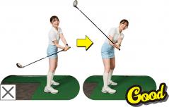 手先でクラブを上げてしまいスイングアークが小さくなるうえ、ダウンでも上半身の回転が足りないためにクラブが寝て下りてくることで、ミート率が下がってミスにつながっていた!