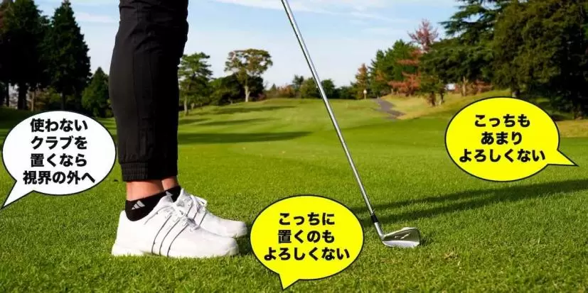 なお、クラブではありませんが、パターカバーの置き場所にも注意しましょう。これも視界に入らないところに置くという原則を守りましょう。視界の中に、自分のものは絶対に置かないという意識を持つことが大事です。