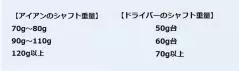 例えば、アイアンにの90g以上のシャフトを入れている場合、そのドライバーのシャフトが50g以下では軽すぎると考えてください。