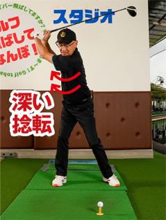 バックスイングは上体を十分に捻転し、飛ばしのパワーを蓄える動作です。そのためには下半身が緩まないようにすることが大事なポイントです。