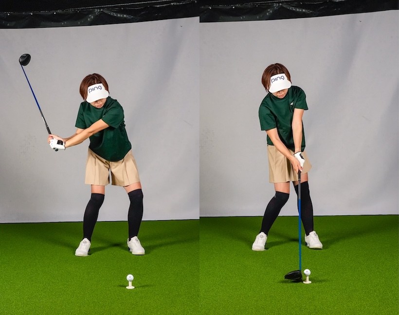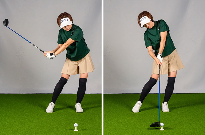 では、どうするか? ポイントは左ヒザです。切り返しのタイミングでは左ヒザと左腰が一瞬前に動きますが、左ヒザがそのまま流れてしまうとスエーになります。ですから前に出た左ヒザは戻さなければいけません。つまり一瞬前に出た左ヒザが伸びる格好になります。切り返し以降で左ヒザが素早く屈伸運動をするような感じで動けると左腰が後ろに引けて体がクルッと回転するのです。
