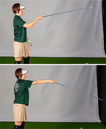 これは釣竿でキャスティングする動作をイメージするとわかります。遠くにキャストしたければ釣竿を目標方向に振り出してからピュッと自分の方向に引き戻します。振り出したままでは勢いがつかないからです。スエーはこの“引き”の動作が入らないパターンで、“引き”さえ入ればスエーせず、その場で素早くクルッと回りながらボールを打つことができます。