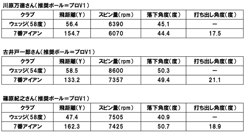 以下が6名の実打データ。いずれも数発打った中からベストに近い当たりをピックアップしたもので、一番下がベストデータに基づいて推奨されたボール。座学で示されたように、グリーンを狙うスコアリングショットがボール選択のポイントということなので、ここではウェッジとアイアンのデータを紹介する。