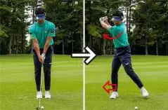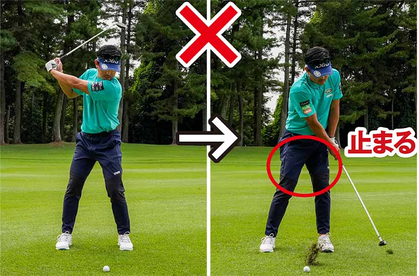 本番のショットだけでなく打つ前の素振りでもダフりやすい人は、間違いなくその傾向があります。下半身がスムーズに動いていれば、上体の突っ込みを簡単に防げることを頭に入れておいてください。
