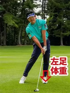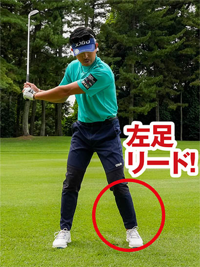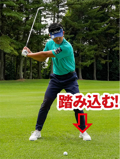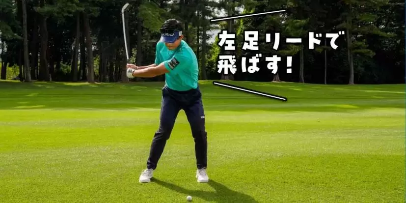 わかりやすくいえば、ダウンスイングは「左足リード」です。トップからダウンスイングへと切り返すときに左足に体重をグイッと乗せて、左足を踏み込んだ体勢でインパクトを迎えることでミート率がアップし、体重移動のエネルギーを下半身のパワーに転換でき、飛距離がアップします。