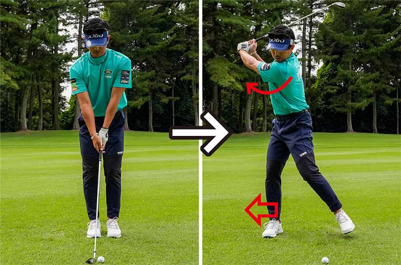 そしてバックスイングで右足を飛球線の後方側に踏み出し、右足だけで立つようにしてカラダを大きく回します。次にそこから左足を目標方向に踏み込んでクラブをフィニッシュまで振り抜きましょう。