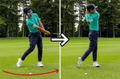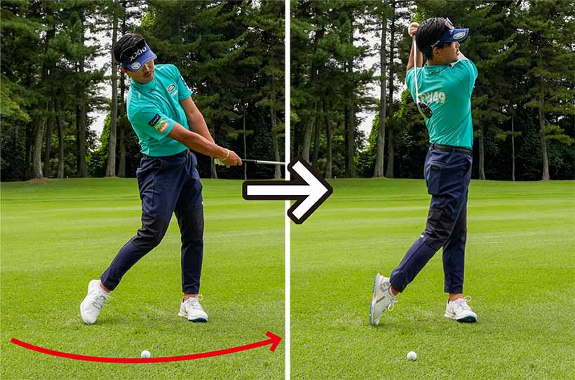 切り返しで左足を先に踏み込み、左足にしっかりと圧をかけたインパクトを通過してクラブを気持ちよく振り抜くことでインパクトゾーンが直線的に長くなります。