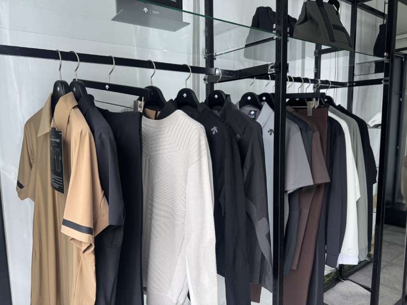 「デサント」ブースでもウェアやゴルフアイテムを販売。先端のテクノロジーを駆使し、ゴルフに特化した機能を曲線で表現した最上級モデル「g-arc」シリーズも購入可能。ちなみに、「g-arc」とは、スイングの軌道をモチーフにしたデサントゴルフの象徴「g」にスイングアークから「arc」を抜き取り組み合わせた造語だとか。