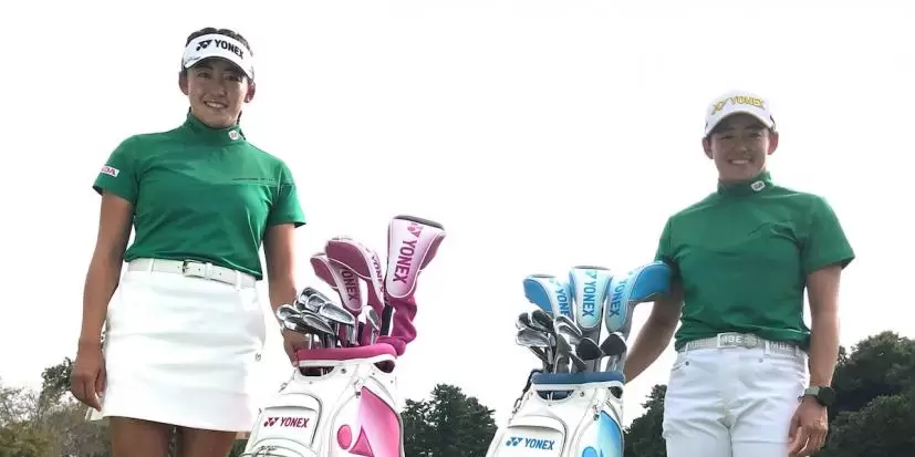 今大会で岩井姉妹の使用するキャディバッグ。ターコイズブルーが岩井明愛モデル、マゼンタ(ピンク)が岩井千怜モデル。ヨネックスのオンライン販売サイトにて各90本限定で予約受付中。岩井姉妹と同一仕様で1〜91までのシリアルナンバーが入る。(岩井姉妹が誕生日Noの75を使用)
