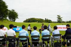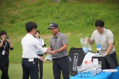 クリニックでは、今年の日本アマ優勝者の道上嵩琉選手へのワンポイントレッスンも実施。「もっと飛ばすにはどうしたらいいですか?」という道上選手の質問には、「とにかくワークアウト!筋トレですね」と即答。さらに「ダスティン・ジョンソンが教えてくれたんだけど、15球くらいを思い切り強く打つ練習をするといい。正確な練習をしたあとに、しっかりパワーをつけるんです」とプロの練習法を伝授した。