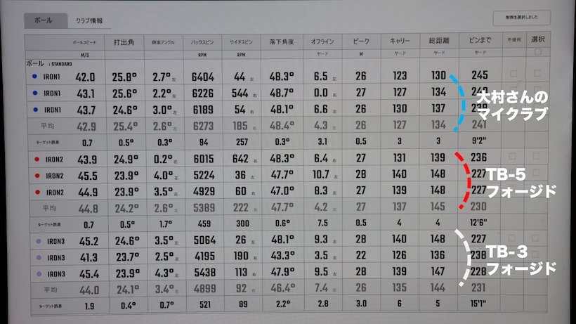 「キャリーも出ているしデータとしては悪くありません。ただ、大村さんくらいヘッドスピード(43m/s前後)があると振れてきたときに『TB-3フォージド』はつかまりすぎる傾向が出てきます。ショート番手でターゲットをねらいやすいのは『TB-5フォージド』だと思います」(長谷川氏)