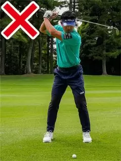 「肩を回そう」と自分で思っていても実際は肩が十分に回り切らず、腕の動きを借りてクラブを上げてしまっているのです。