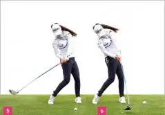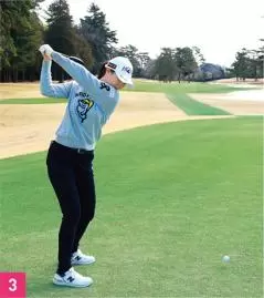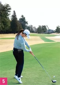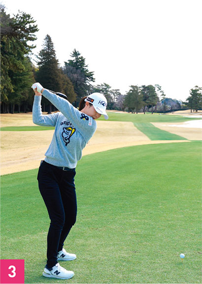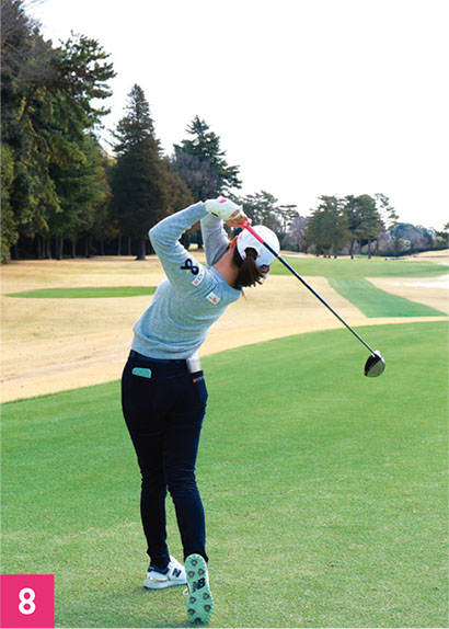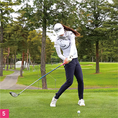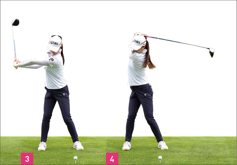 もう一つ、しなやかに見える要素としては、胸がしっかり回転していること。トップでは胸が目標と反対方向を向くまで上半身を回しています(写真04)。そして、ダウンスイングでは胸の開きを抑えつつ、腕を走らせています。ダウンスイングでは右腕を体にピッタリとつけるのではなく、少し離しています。メリット、デメリットはあると思いますが、右腕を体から離していることによって、右腕をフォローで一直線に伸ばしやすい。金澤選手は右脇腹を縮めながら、大きなフォローを出しているタイプなので、右腕を伸ばしていくことでより大きなスイングになっています。右腕を伸ばすことで、ボールをつかまえるためのハイフィニッシュにもつながっています。