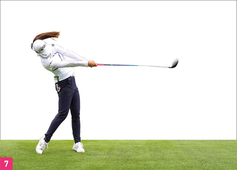 金澤選手は手元(手首)の通り道、レッスン用語では「ハンドパス」と呼ばれる動きが理想的。典型的なドローヒッターのハンドパスになっています。トップでは手元が低い位置にあって、コンパクトな姿勢(写真03)。ダウンスイングでは手の位置を高くしながら一気に加速しています(写真05)。そしてフォローからフィニッシュにかけては手元が高い位置にあり、ハイフィニッシュになっています(写真07)。低いトップから高いフィニッシュに向かって振り上げれば、ゆるやかなインサイド・アウト軌道になるのでボールをつかまえることができます。