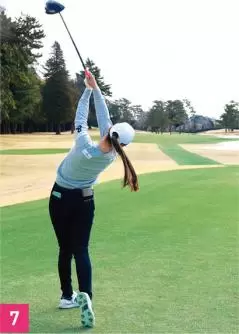 最近の日本女子ツアーでは250ヤード以上飛ばすパワーヒッターも少なくありません。金澤選手も試合では250ヤード近く飛ばすティショットを打っていましたが、パワーというよりも、体全体を弓のようにしなやかなに使って飛ばすタイプ。遠心力を最大限に使って、ヘッドスピードを上げています。