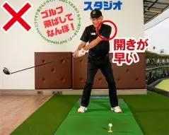 左肩が早く開いてしまうとクラブヘッドが早く落ちて、手首も早くほどけます。これがアーリーリリースの招待です。