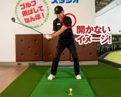 ダウンスイングで胸をボールの右側に向けておくイメージで振り下ろし、左肩の早い開きを抑えましょう。