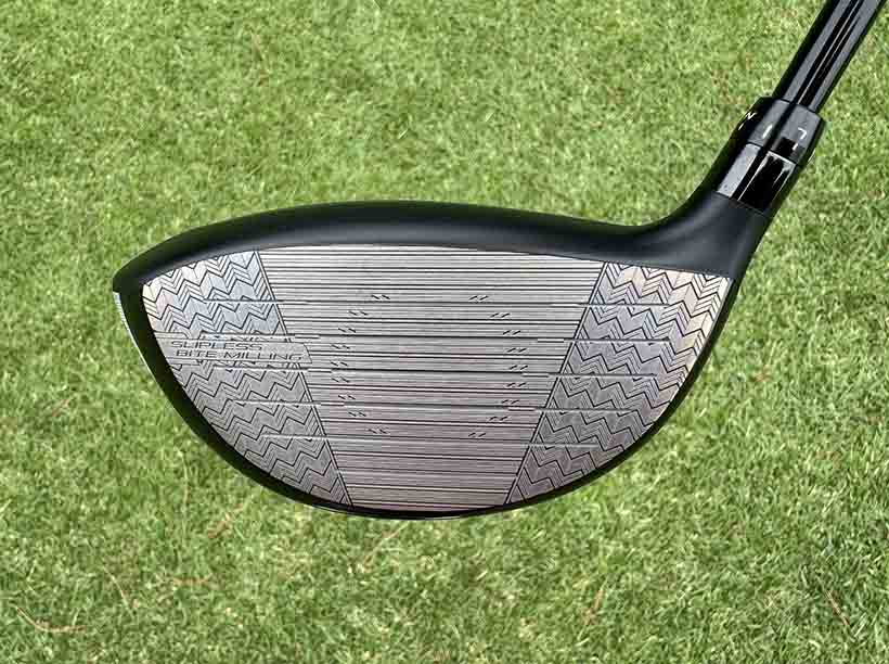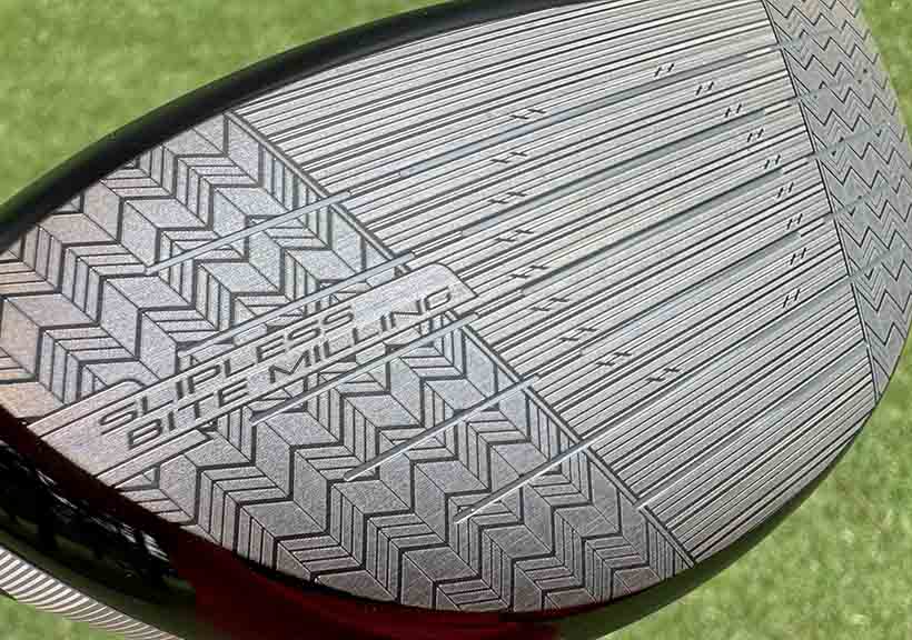 このヘッドの特徴としては、まず「BITING FACE 2.0(バイティングフェース2.0)」。これは、フェース全面に施された独自の「スリップレスバイトミーリング」により、インパクト時のボールの滑りを抑制し、ボールへの食いつきをさらに高めています。手で触れてもはっきりと感じられるそのザラザラ感は、前作比で約250回転ものスピン量減少効果をもたらすとのこと。