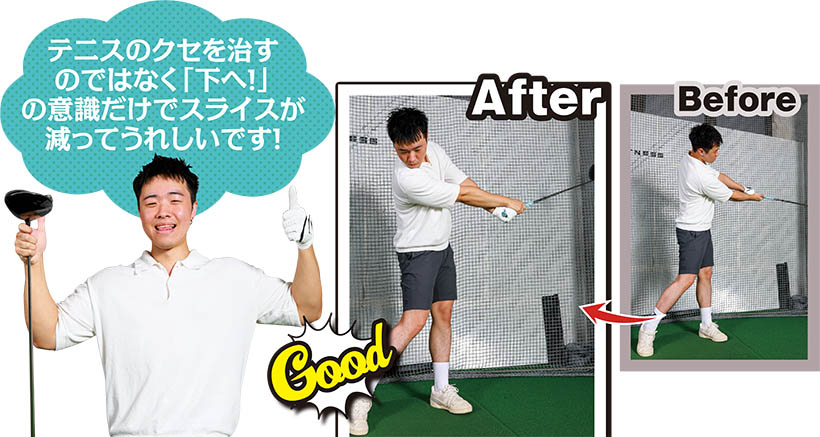 テークバックではクラブフェースが、インパクトでは胸が開いてしまいテニススイングの応用のようなスライスが出やすいスイングになり球を擦るようなミスが頻発していた!