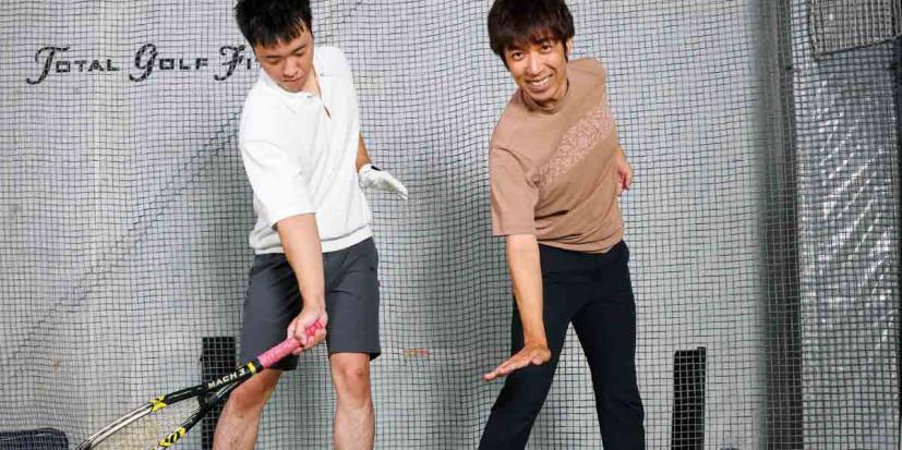 (写真左)テニスは打つ球の位置と目標の方向が同じだから……(写真右)インパクト時には胸が目標方向へ開いてしまいがちに!
