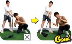 (写真左)飛球線方向ではなくトップから「下へ!」の意識を持って(写真右)地面の球をしっかり打ち抜くことで球は目標へと飛んでくれる!