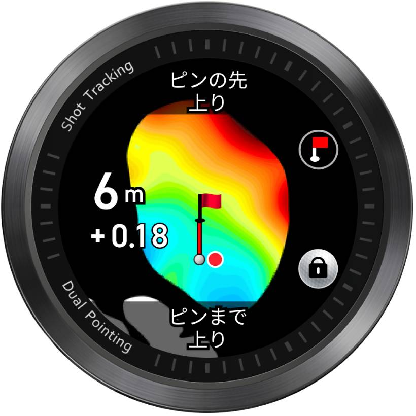 さらに、グリーンを長押しすることでグリーンの形状やアンジュレーションの詳細、ピンを基準とした縦横ヤードを把握することができ、最適なアプローチルートを表示。