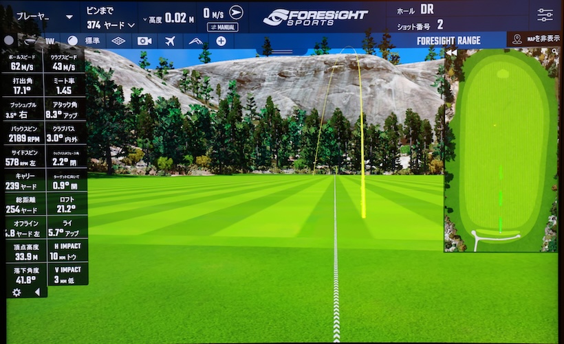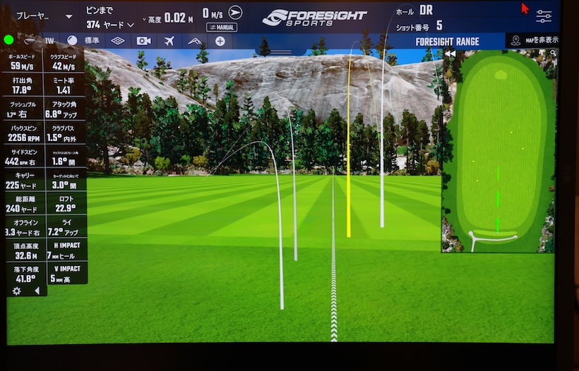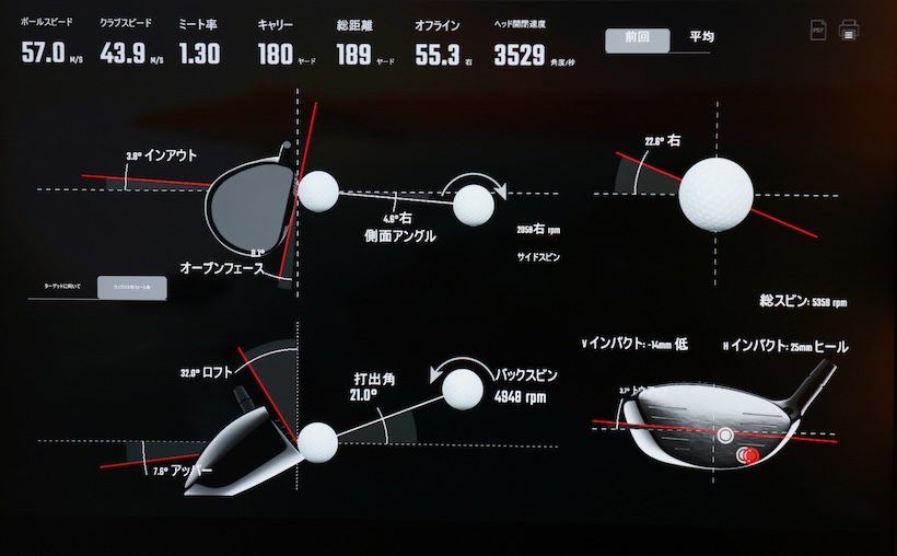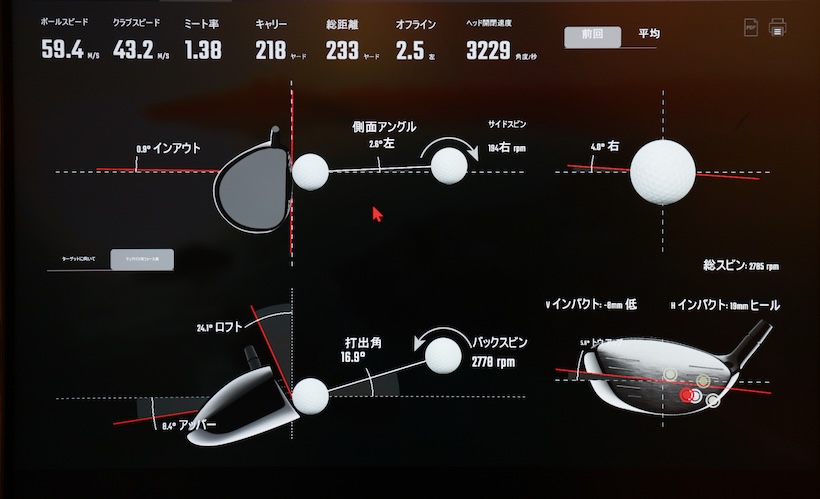 当たった瞬間に「気持ちいい」と叫んだ野﨑さん。球筋はストレートに近いドロー。3000回転近くあったスピン量も2200回転と理想値に収まってきた。それまでトータルで240ヤードしか飛ばなかった飛距離も254ヤードまで伸びた。