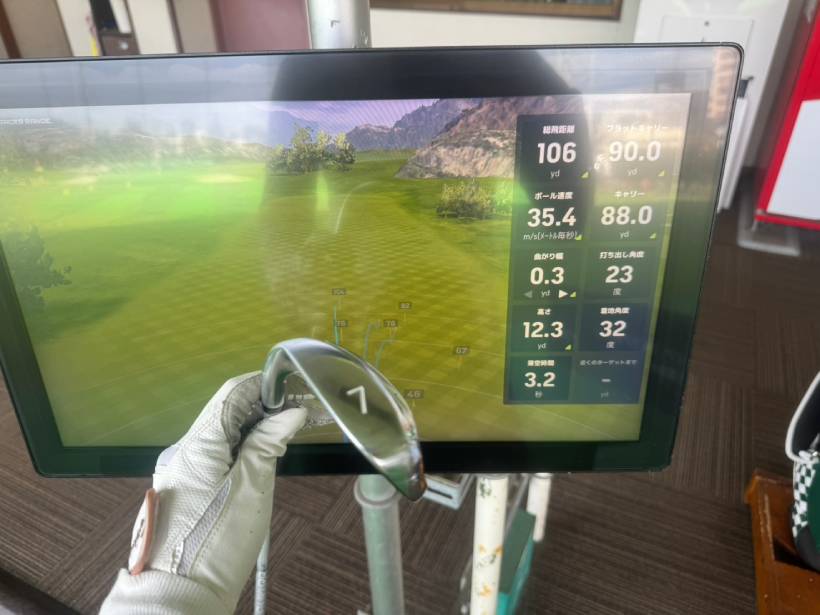7番アイアンは106ヤードで、9番アイアンは95ヤード、PWは69.6ヤード。アイアンは、だいたい思っていた距離と合っていたので安心。