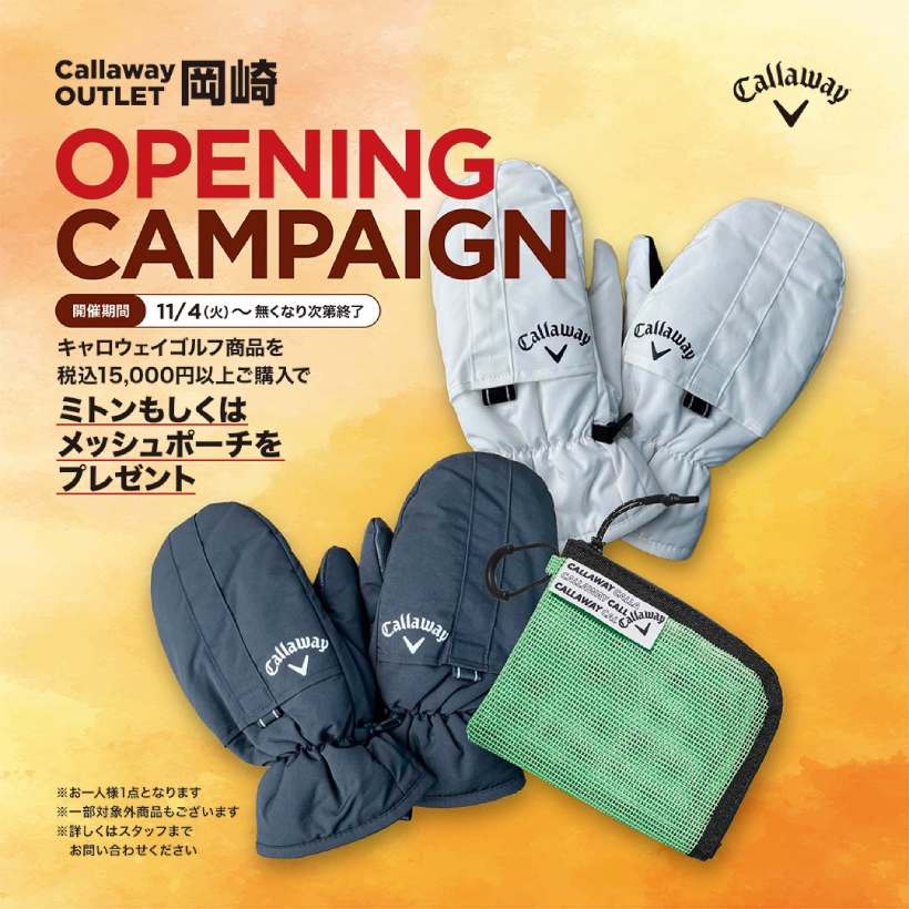 オープンを記念し「オープニングキャンペーン」も開催。キャロウェイゴルフ商品を税込1万5000円以上ご購入で、ミトンまたはメッシュポーチのノベルティをプレゼント。