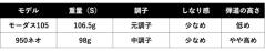 また、モーダス105はR、S、Xの3種、950ネオはR、SR、S、Xと4種の硬さがあります。私が言う振動数とは硬さのことで、全7種類を振動数の多い(軟らかい)順に並べて重さを示したのが以下の表です。