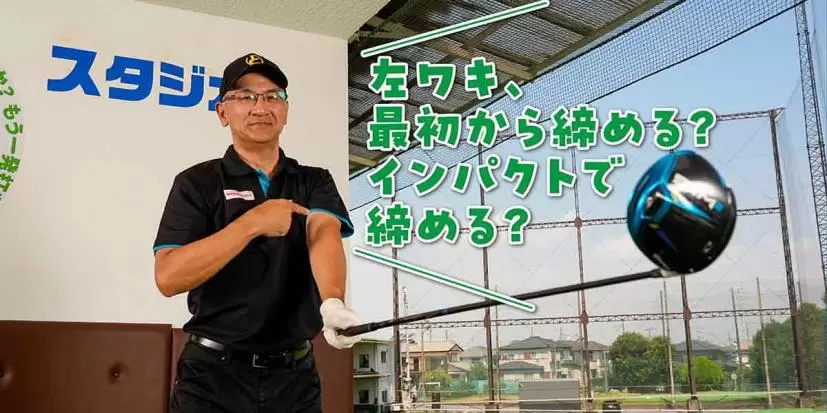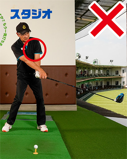 左ワキがあいてはいけないと思って、インパクトに向かう途中で左ワキをギュッと締めるのはよくありません。左ワキが硬くなってカラダの回転にブレーキがかかり、手をこめてしまいやすいからです。