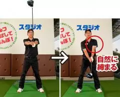 左ワキの締まり感覚によって捻転が深くなり、スイング軌道がより安定する
