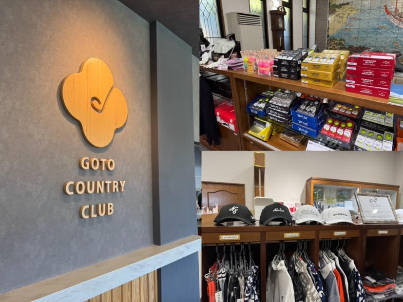 椿をイメージした五島カントリークラブのロゴは、2年ほど前に島民の女性がデザインし一新。ロゴの真ん中がゴルフクラブになっており、おしゃれ。受付の後ろにあるショップでは、ゴルフボールやグローヴ、ウェアやキャップ、スキンケアなども販売されていた。