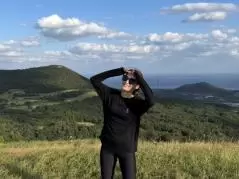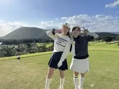 五島観光名所の一つ「鬼岳」の前で記念撮影。どこを切り取っても絵になる五島カントリークラブは、ゴルフ女子の心もガッチリと掴んでくること間違いなし。