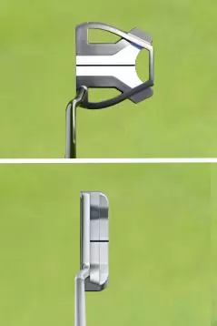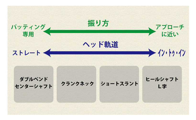 パターに打ち方を合わせるという視点で、あらためてパターを見てみると、長尺やセンターシャフトまたはダブルベンドでフェースバランスになっているものはストレートな軌道に適していることがわかる。その対極にいるのが、L字とかヒールシャフトのパターで、これらはショットに近い打ち方に適している。