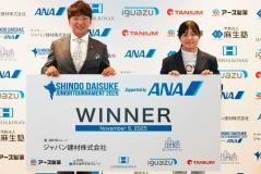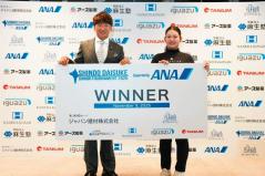 「1.5mと3mのイーグルパットが決まってくれました。最終ホールは緊張してボギーにしてしまいましたが、優勝できてよかったです。(来年のANAオープンに)初めてプロのツアーに出られるで、とてもうれしいです。進藤さんは有名なキャディさんなので勉強したいです。」