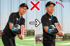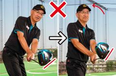 テークバックで両腕を右側にネジってフェースが開く人は、上体を起こすとフェース面が斜め上を向きます。こうしたタイプはインパクトエリアで両腕が急激に返りやすく、フェースがかぶりすぎてボールが左に飛んでしまいます。