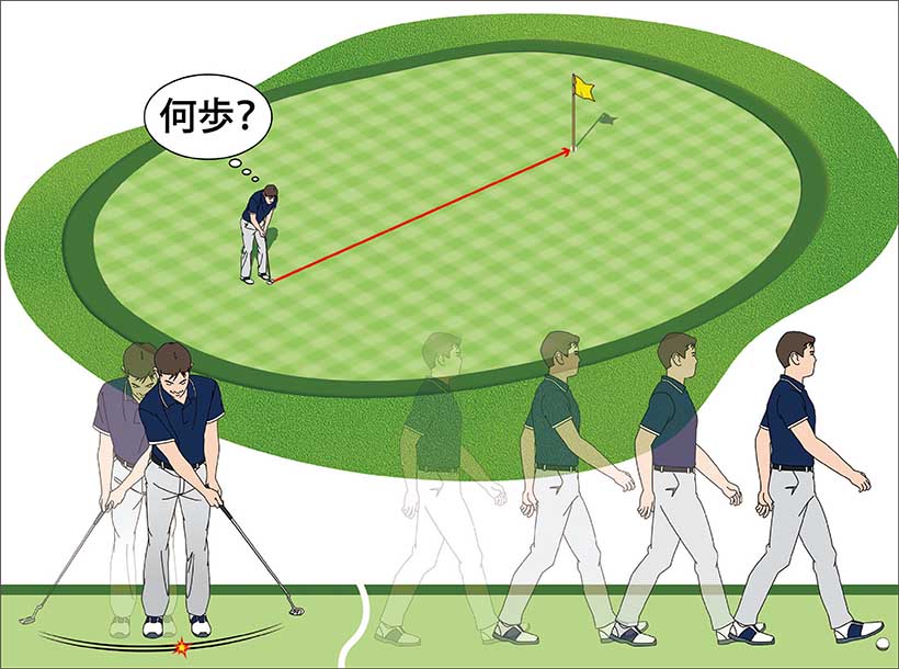 自分の一番気持ちいいストロークというか、パターを自然に振ったときにボールがコロがる距離の基準を知っています。何も考えずに気持ちいいストロークでボールをポーン、ポーンと3球続けて打つと、3球とも大体同じ場所で止まります。そして止まった場所までを歩測して実際にコロがった距離を把握しておく。10歩とか12歩とか距離の基準はプレーヤーによって違いますが、これがロングパットを1パット圏内に寄せる決め手となるのです。