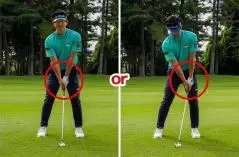低い球を打ちたいときやライン出しのショットなどはハンドファーストに構えることはあっても、通常は手元をカラダの中心線上にセットするか、軽くハンドファーストに構える程度にしましょう。