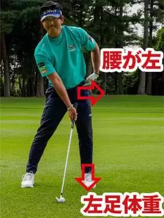 腰が左にターンすれば腰の位置も手元の位置もアドレスよりも左側となり、自然にハンドファーストインパクトが作られます。