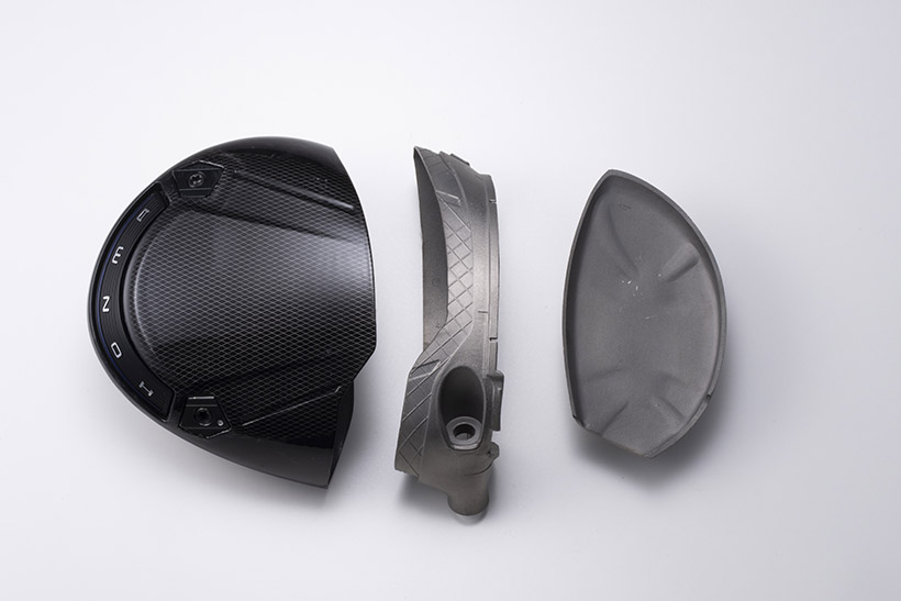 「小川社長は新しい素材の開発にも積極的ですし、今回は外部から新しいデザイナーがきて、デザインありきのところからスタートしました。それがソール中央に強調された“モグラ”のデザインです。長年、酒田工場では設計、開発を進めた後にデザインを決めていたのですが、『TW777』はその順番が逆になった。最初のデザイナー案はチタンボディを前提にしたものでしたが、どうしてもカーボン比率を上げたかったので、そこはゆずれなかった。何度も会議をして、ときには衝突することもありました。最終的にはチタンカーボンを採用した上で、ソールの中央にモグラを大きく配置して、性能を落とすことなくデザイナーのアイデンティティも生かしたヘッドにしました」