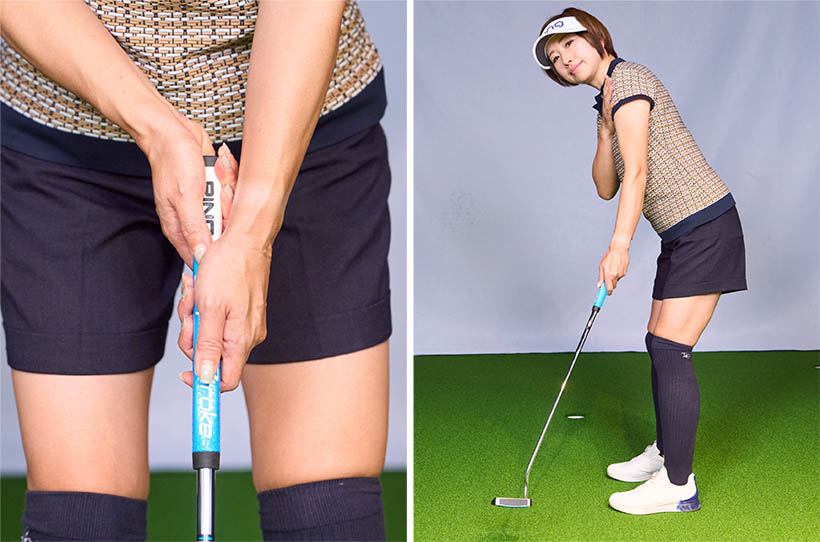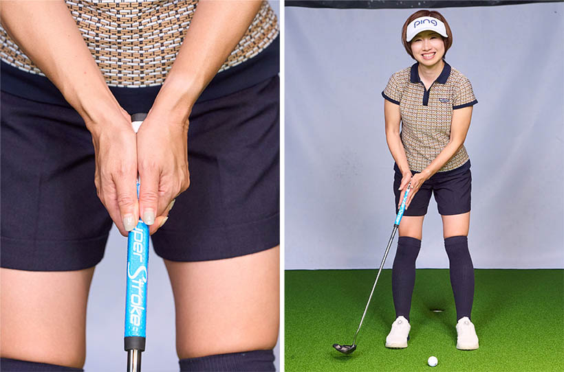 オーソドックスな順手グリップは右手(利き手)のひらでボールを押すイメージが出やすいためフェースコントロールという点でメリットがあります。順手で調子が悪くなったら、まず右手のひらとフェースを重ねてストロークしてみるといいでしょう。もちろんショットと同じスタイルで握るのもあり。ショットと同じ感覚で打てます。右手で打つか左手で打つか、あるいは両手で打つかは、それぞれの感覚でいいと思います。