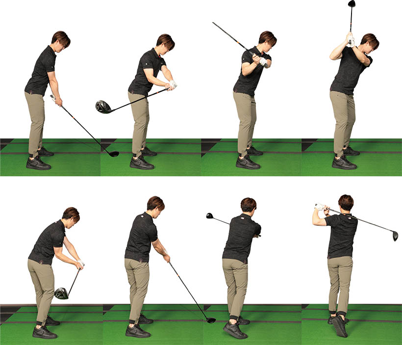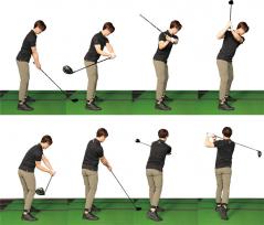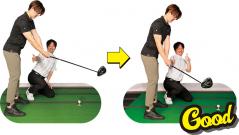テークバックは「右手人さし指は上へ! 左手は下へ!」のイメージが良い。グリップが体から離れがちな人は試してみて!