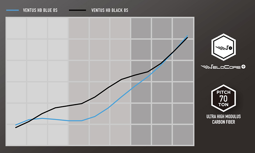 VENTUSといえば複数の高弾性素材をバイアス層に積層することで、オフセンター時のヘッドの捩れを抑制し、優れたボールコントロール性能を実現したVeloCoreテクノロジーが採用されているわけですが、この「VENTUS HB」シャフトではその高弾性素材を更にアップグレートした、「VeloCore Plus」テクノロジーにより、ドライバーシャフトと同様に更なる安定性とボールスピードの向上を実現しています。