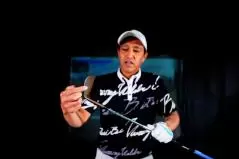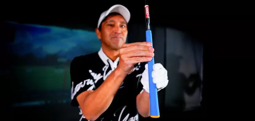 「グリップを握らず、つまんで打ってみてください。怖いけど、 1回こんな感じにつまむ。こうやったら絶対に砂に刺さらない。だまされたと思ってやってみてください」(内海プロ)